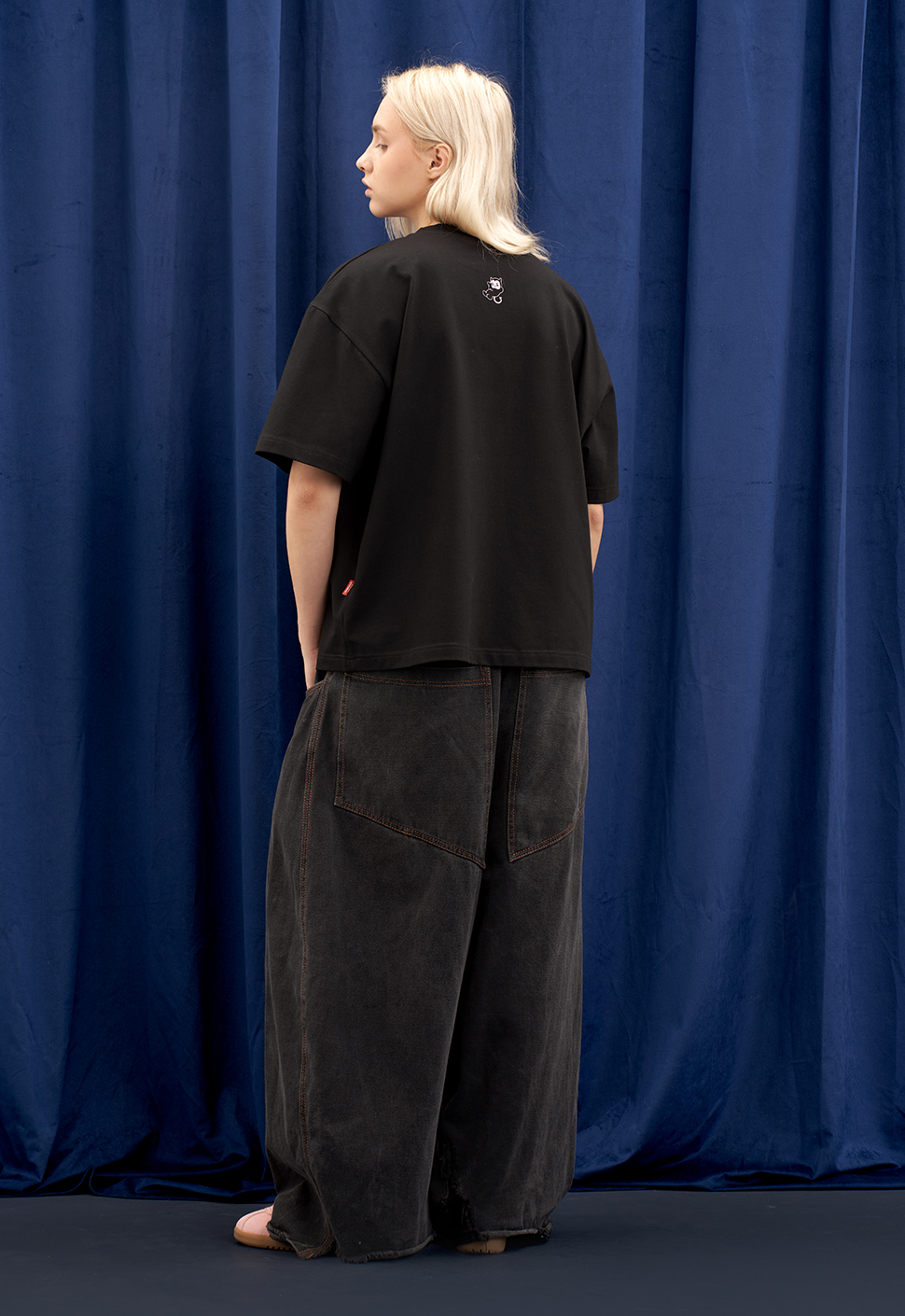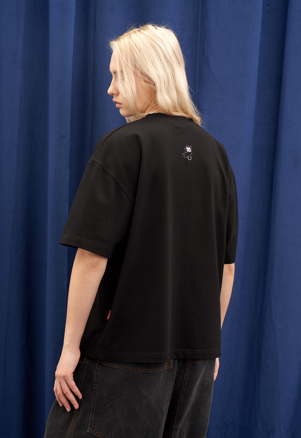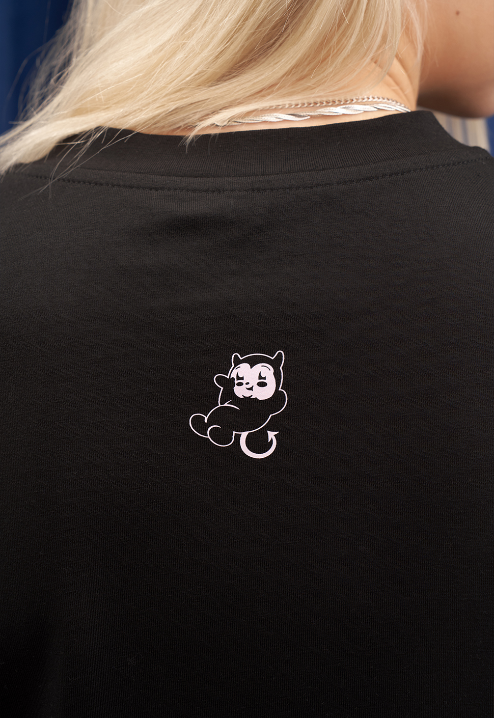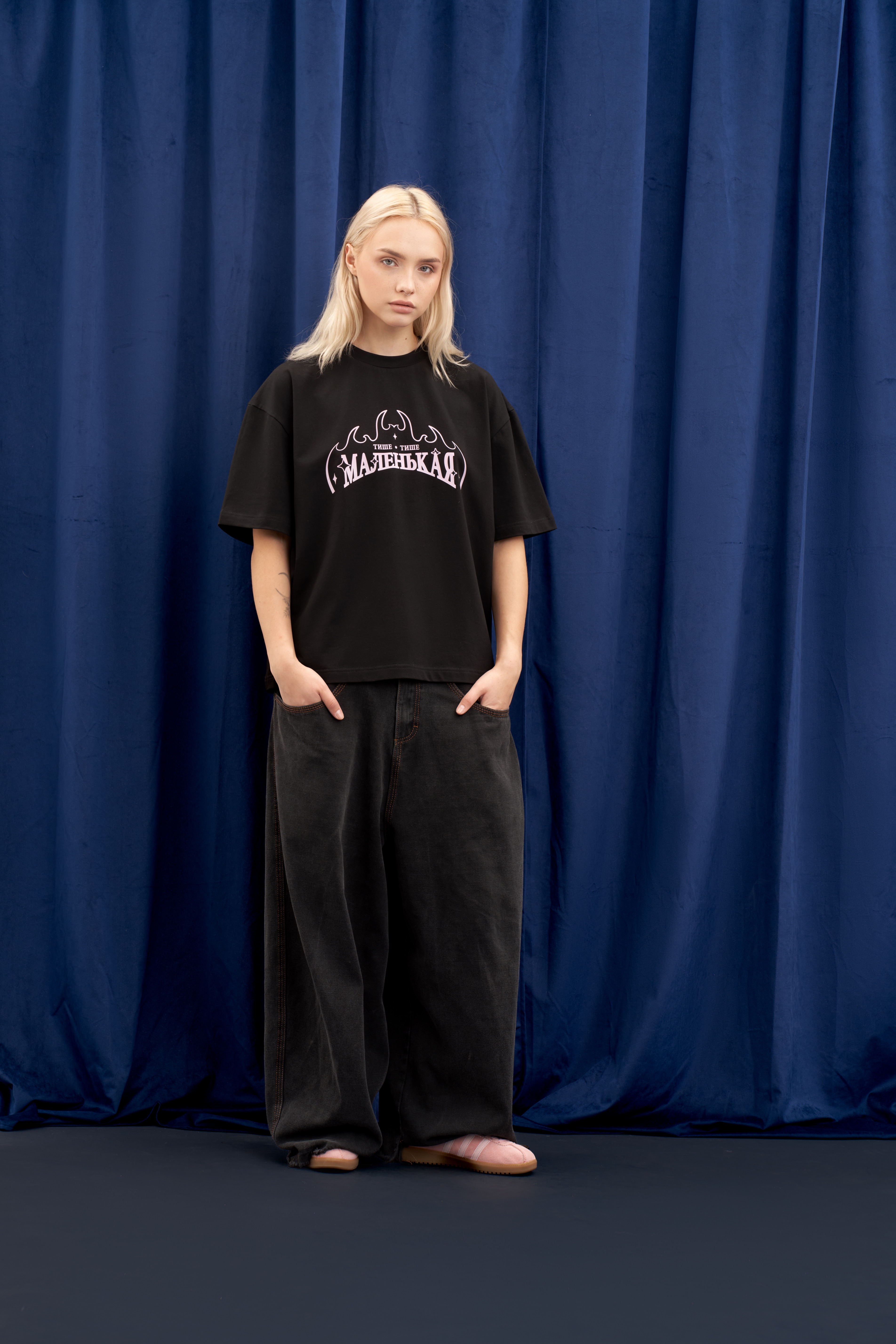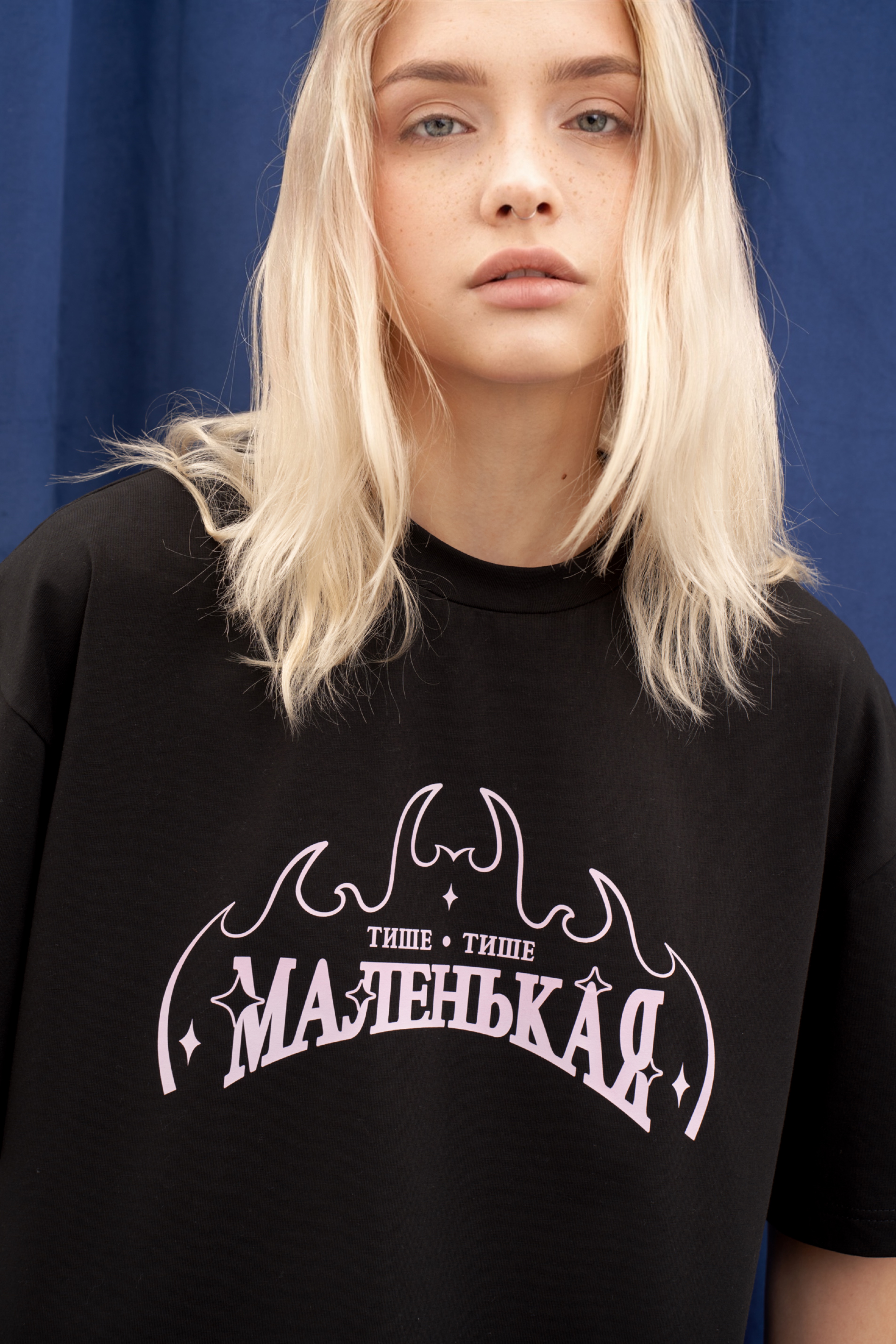 Черная футболка от Приятного Ильдара "Тише Маленькая" oversize кроя выполнена из высококачественного плотного хлопка плотностью 200 гр/м2. Принт на груди и спине выполнен шелкографией. В боковом шве изделия расположена фирменная бирка “Приятный Ильдар”.