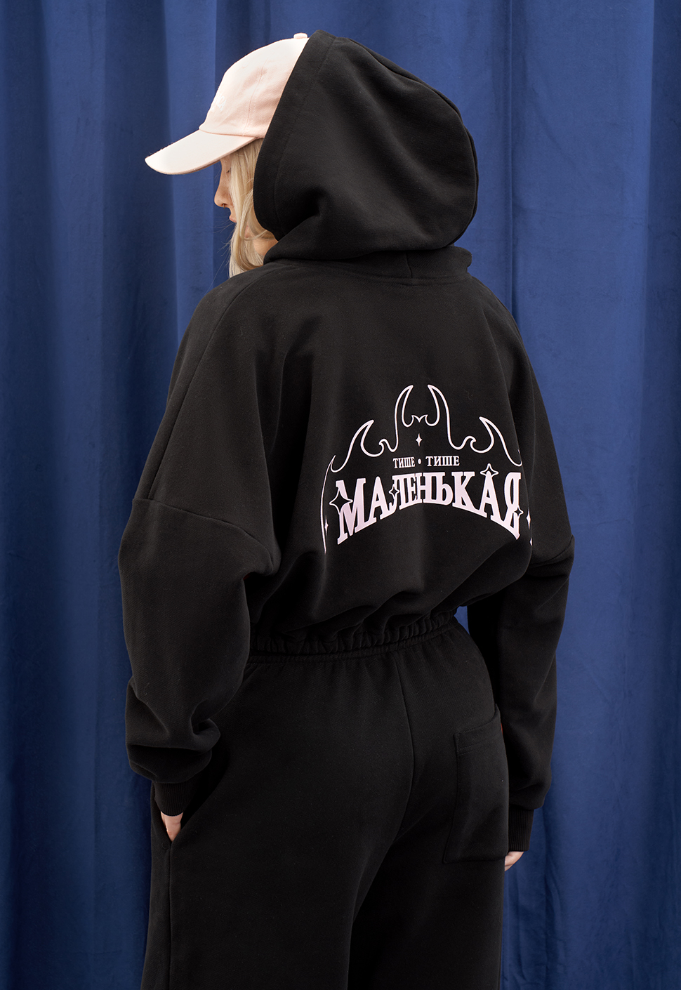 Черное худи от Приятного Ильдара "Тише Маленькая" укороченногокроя выполнена из высококачественного плотного хлопка плотностью 320 гр/м2 с бархатным эффектом. В боковом шве изделия расположена фирменная бирка “Приятный Ильдар”. Принт на груди и спинке выполнен шелкографией.