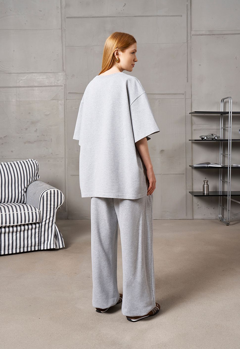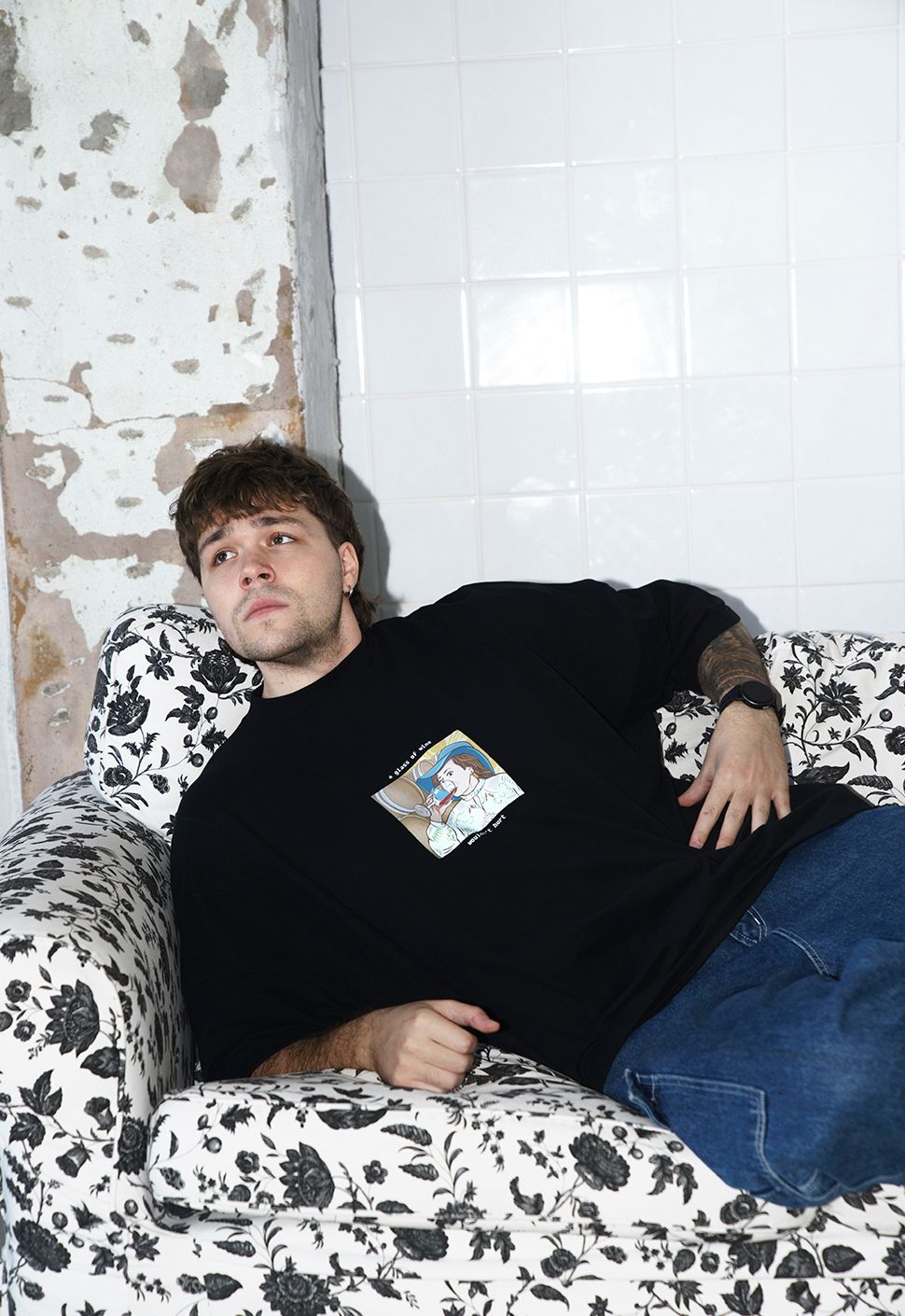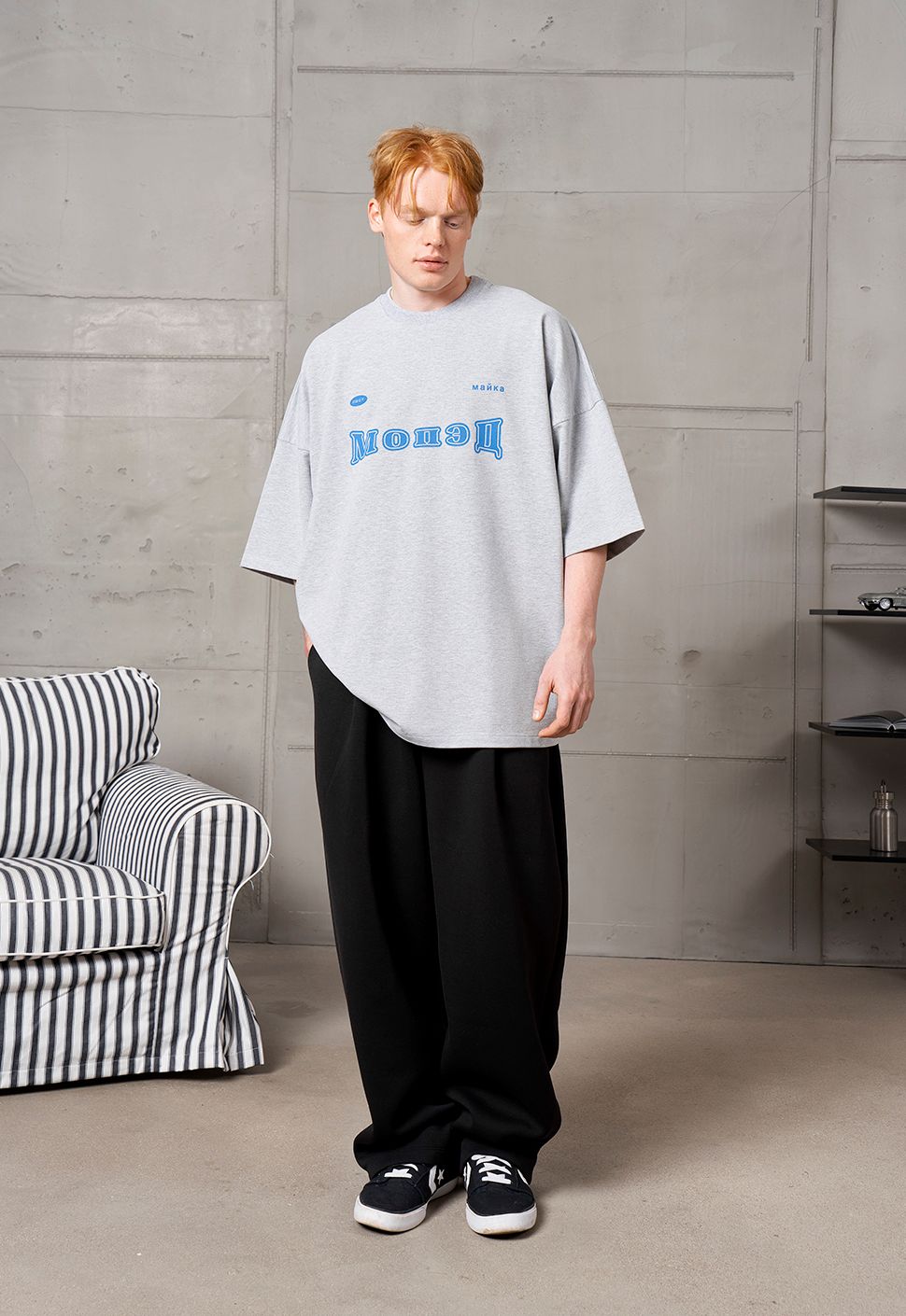 Футболка "МОПЭД" в цвете серый-меланж от Женька выполнена из высококачественного хлопка с примесью эластана плотностью 240 гр/м2. Модель имеет круглый ворот и oversize посадку. Принт на груди выполнен шелкографией.