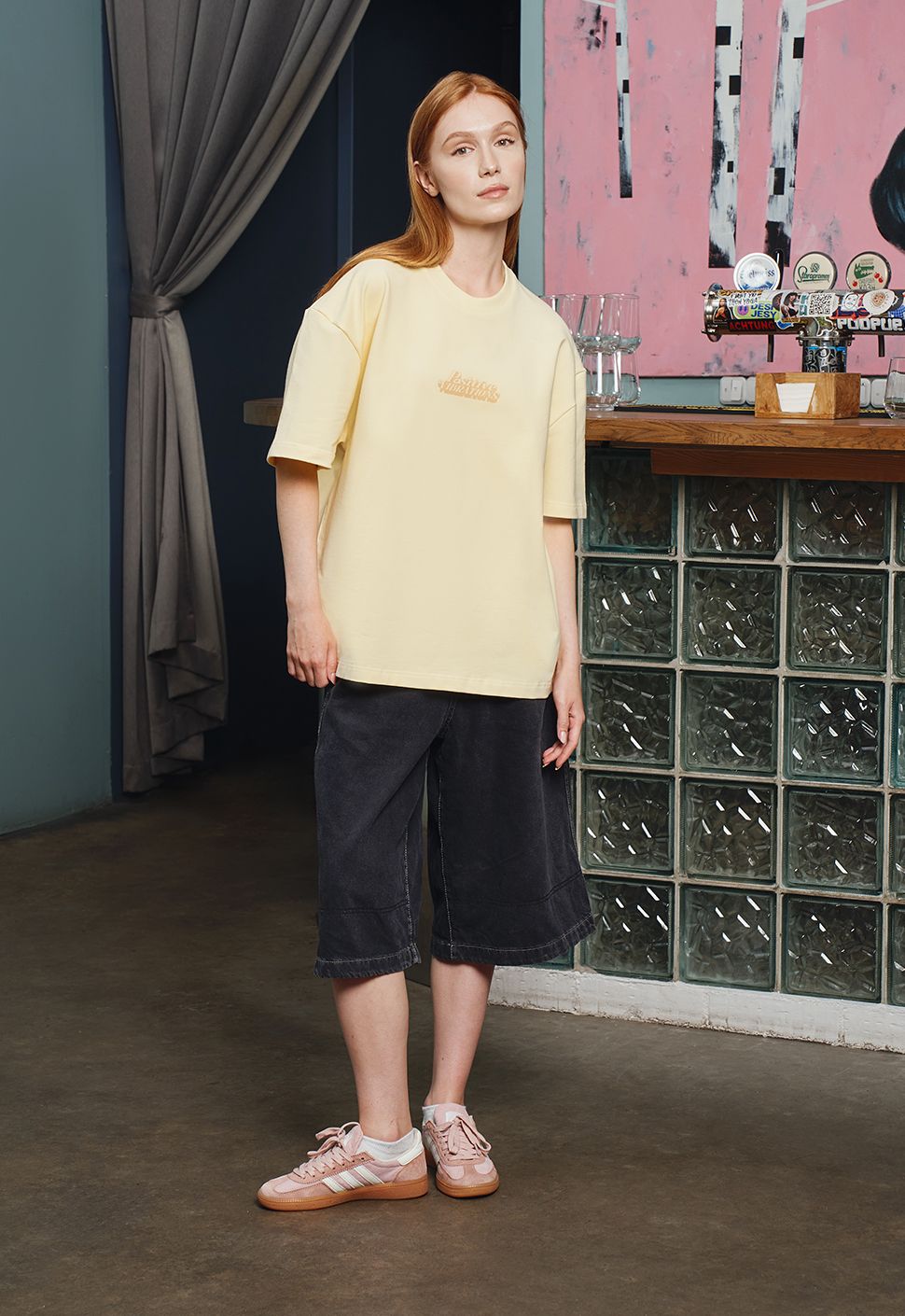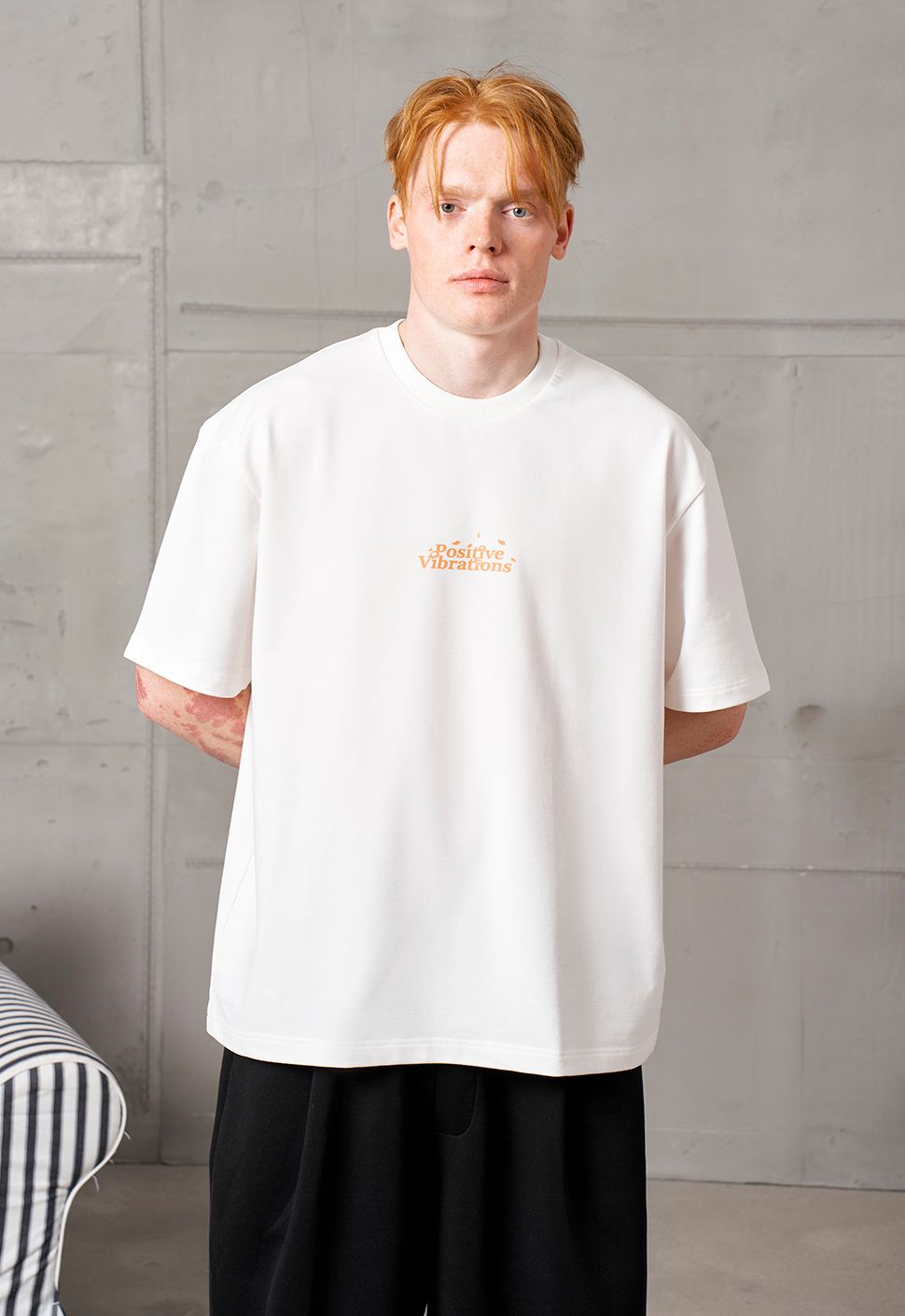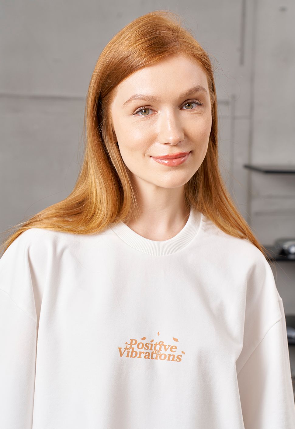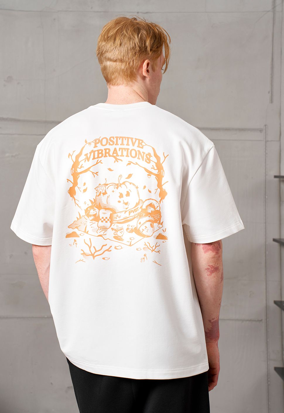 Футболка от Женька "Positive Pumpkin" в молочном цвете выполнена из высококачественного хлопка с велюр эффектом, плотностью 240 гр/м2 с добавлением эластана. Имеет круглый ворот, умеренную длину и oversize посадку. Принт на груди и спине выполнен шелкографией.