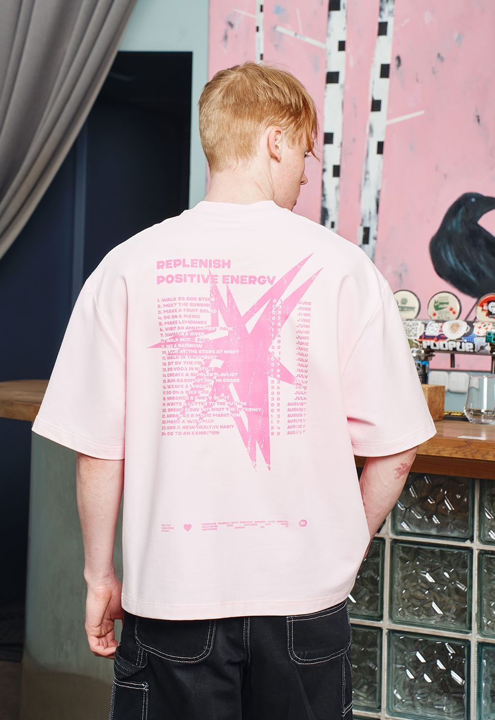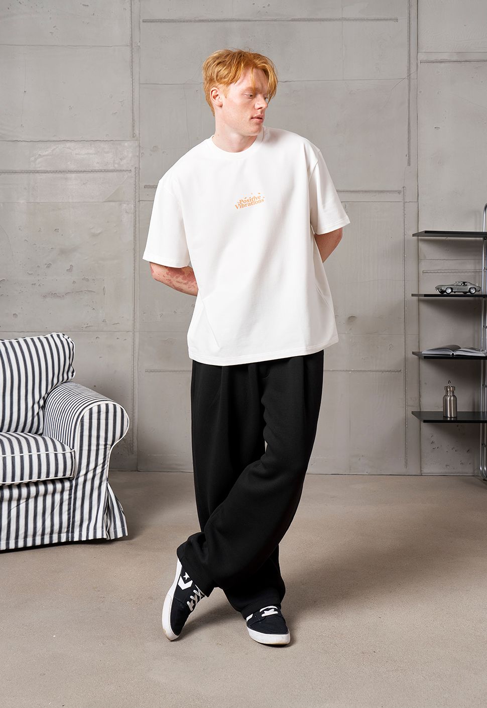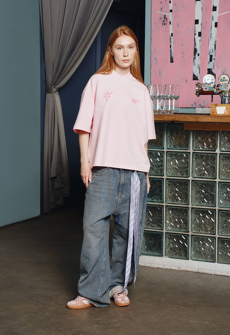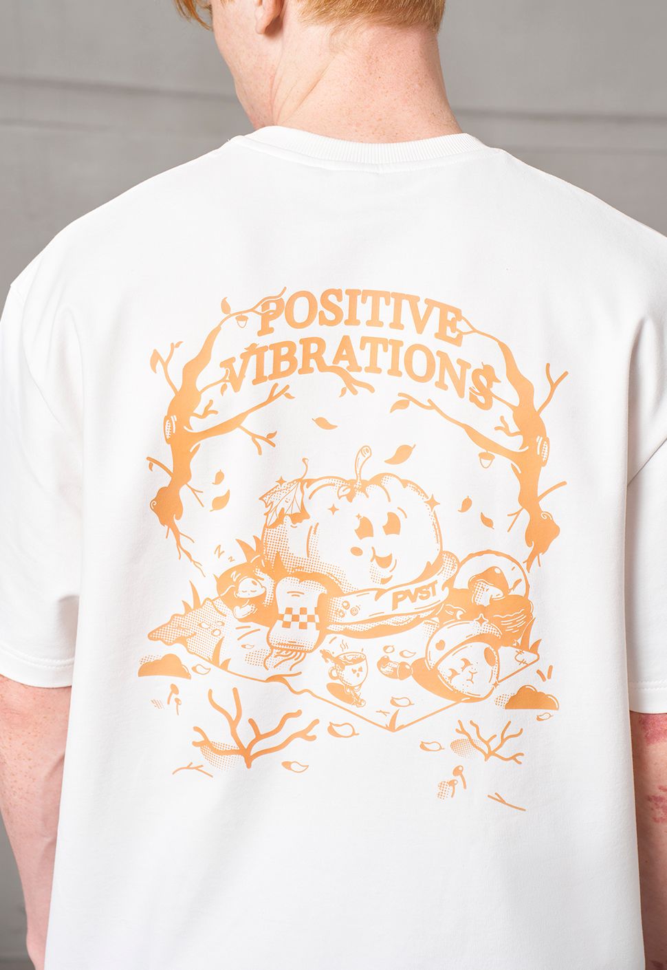 Футболка от Женька "Positive Pumpkin" в молочном цвете выполнена из высококачественного хлопка с велюр эффектом, плотностью 240 гр/м2 с добавлением эластана. Имеет круглый ворот, умеренную длину и oversize посадку. Принт на груди и спине выполнен шелкографией.