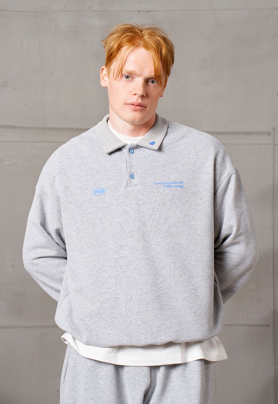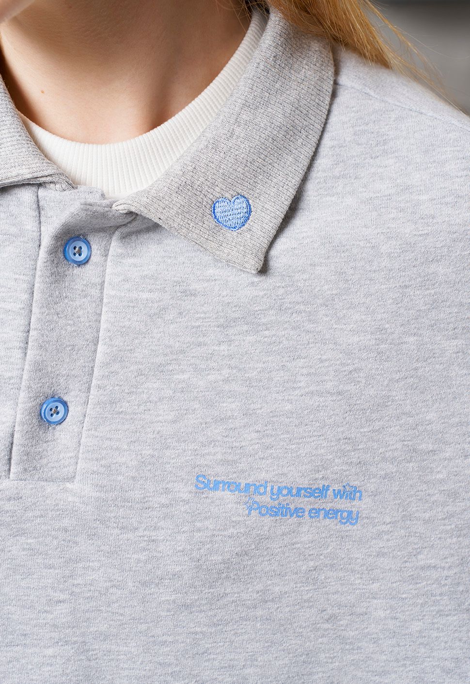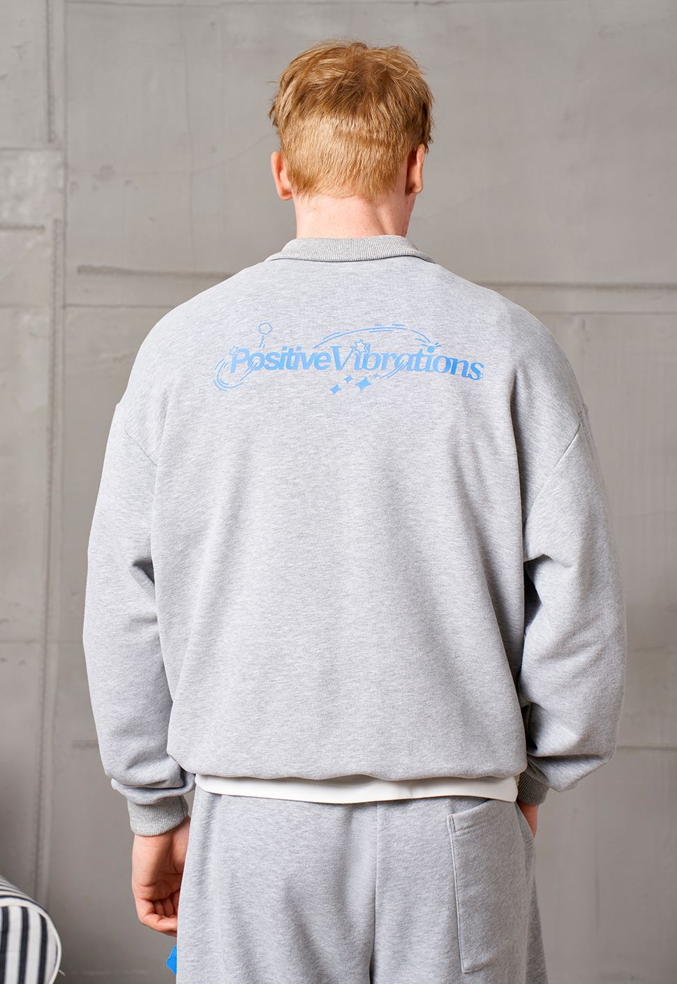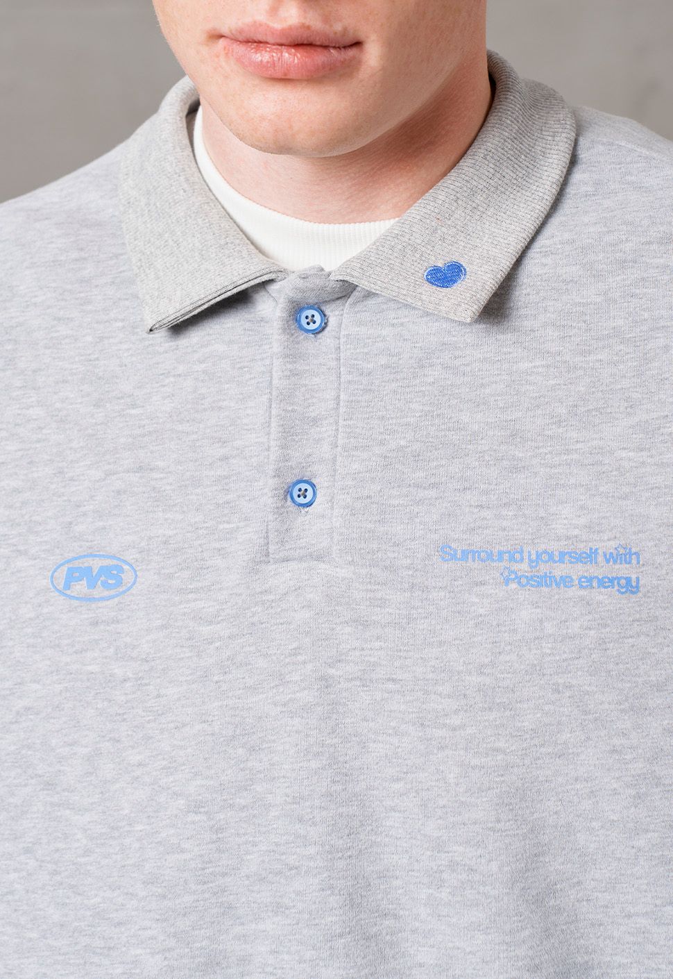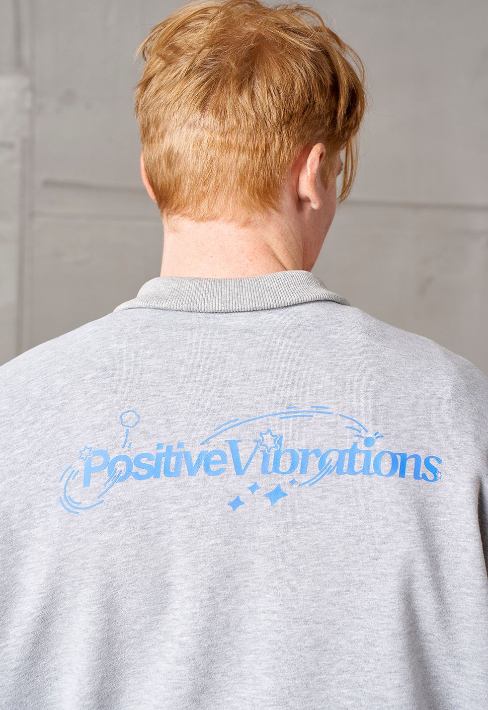 Свитшот-поло от Женька "Positive Vibrations" в цвете серый меланж выполнен из высококачественного хлопка с велюр-эффектом плотностью 320 гр/м2.