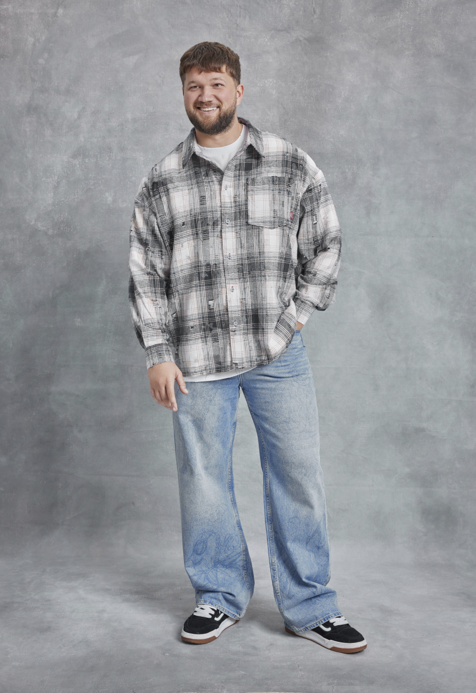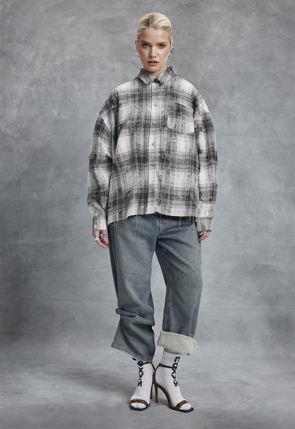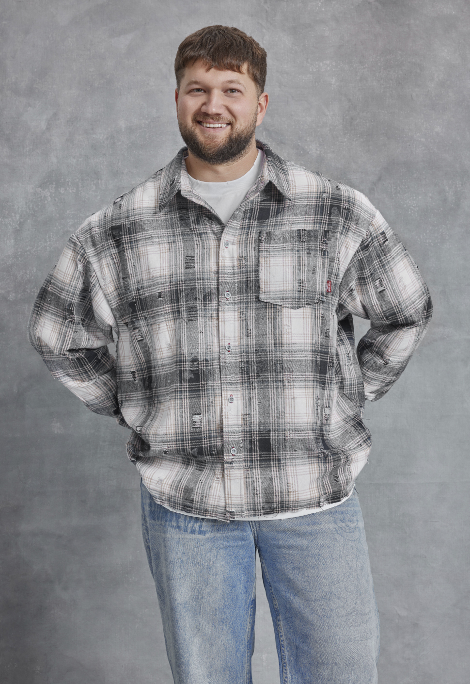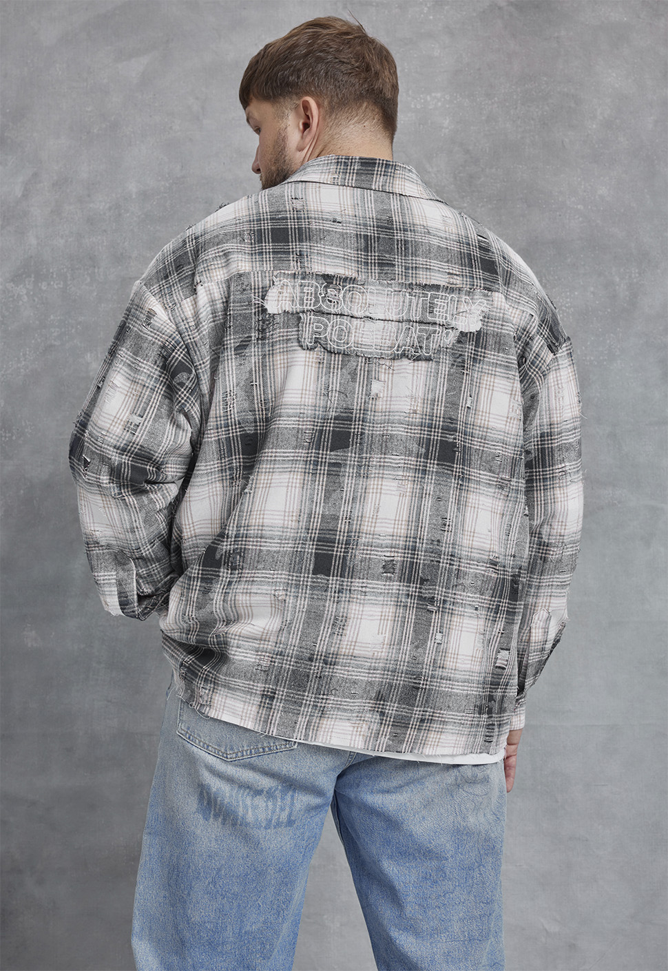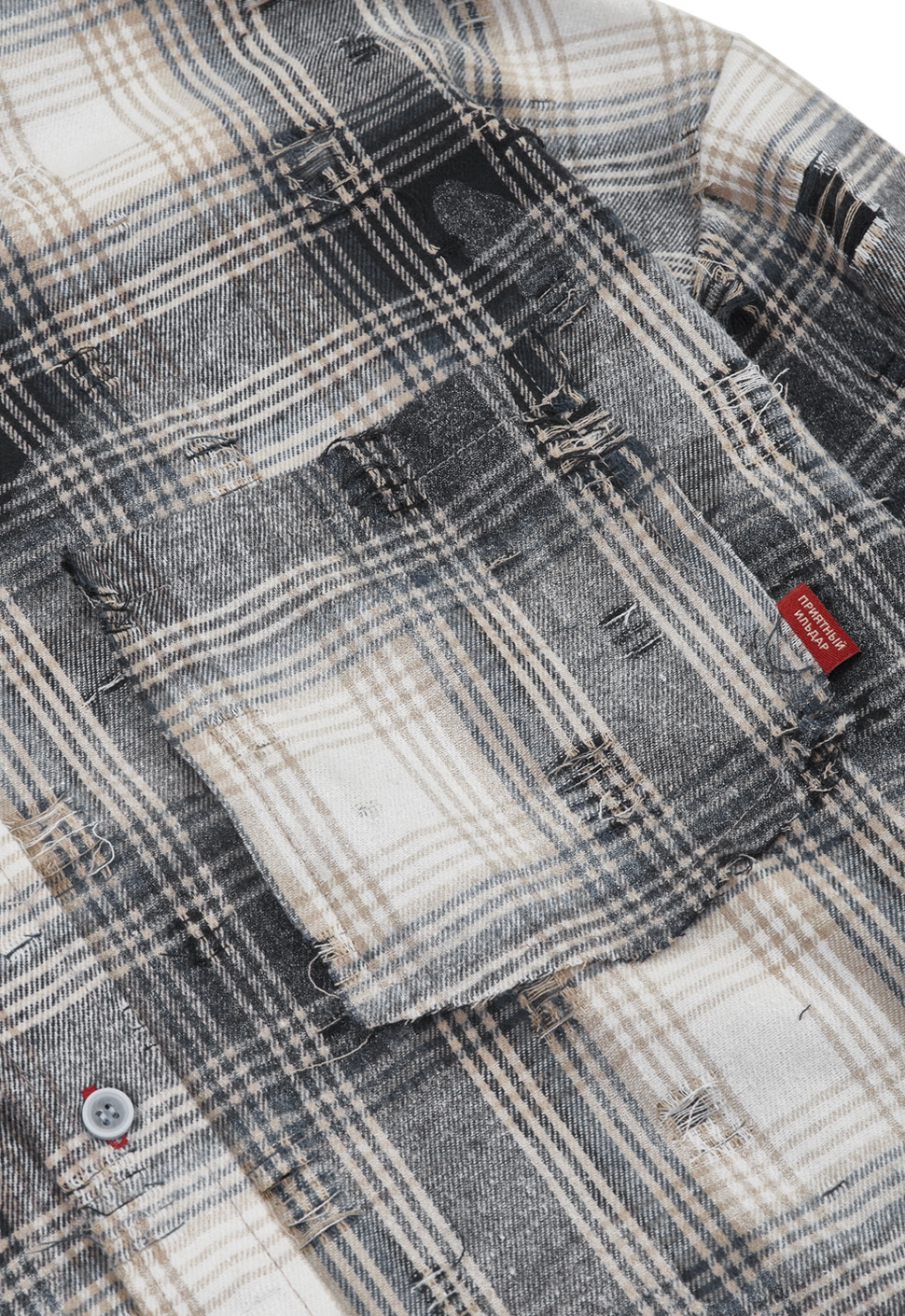 Молочно-синяя рубашка от Приятного Ильдара "Absolutely Po*bat" oversize кроя выполнена из высококачественного 100% хлопка. На передней части изделия расположен карман с фирменной жаккардовой биркой, также на изделии присутствуют контрастные петли, которые делают изделие более акцентным и интересным. Нанесение на спинке изделия сделано машинной вышивкой. Материал рубашки оформлен в стиле гранж — изделие дополнено множеством декоративных порезов и потёртостей.