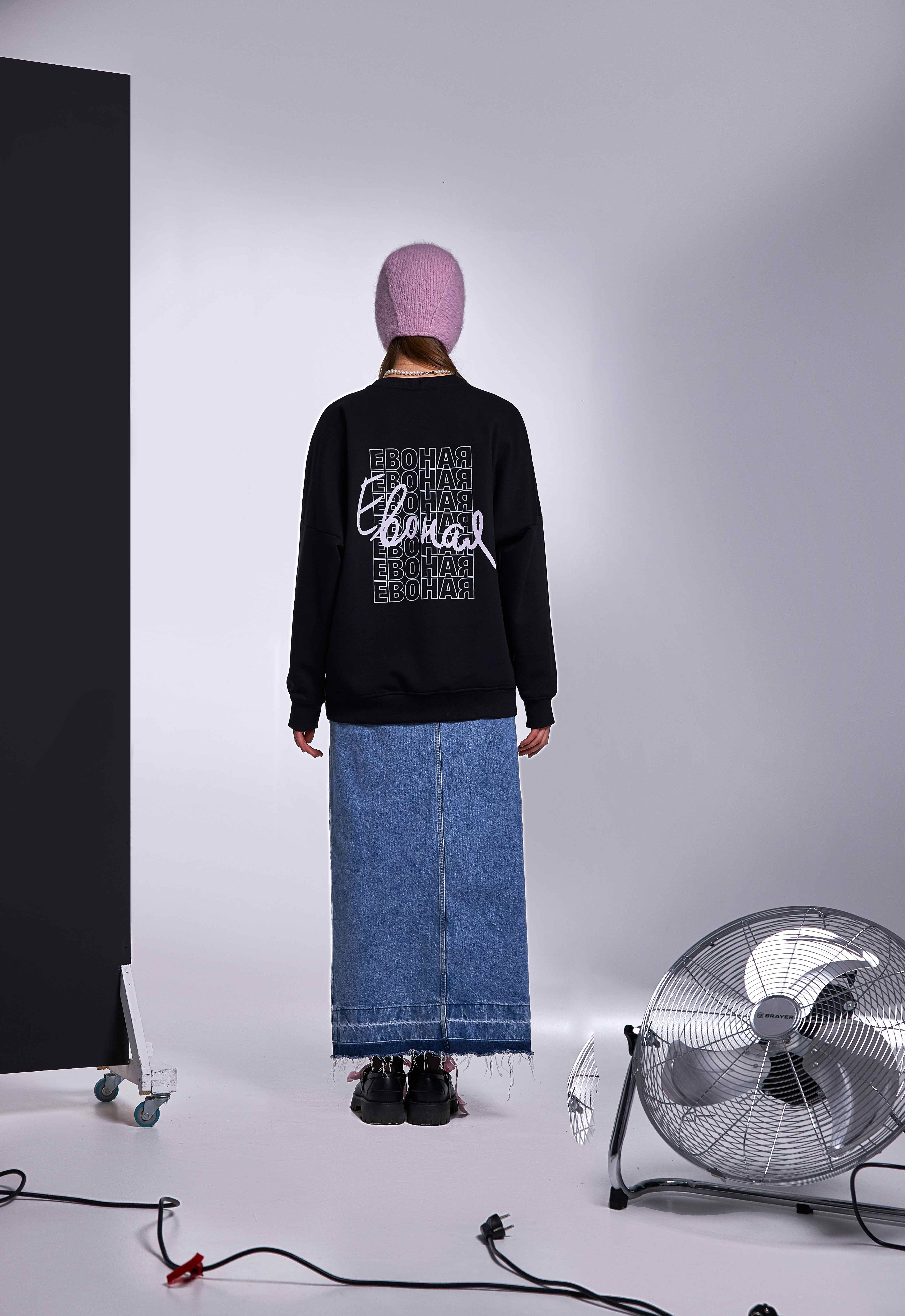 Свитшот от Приятного Ильдара "Евоная" в черном цвете выполнен из высококачественного хлопка плотностью 320 гр/м2. Модель имеет круглый ворот и Oversize посадку. Принт на груди и спине нанесен шелкографией.