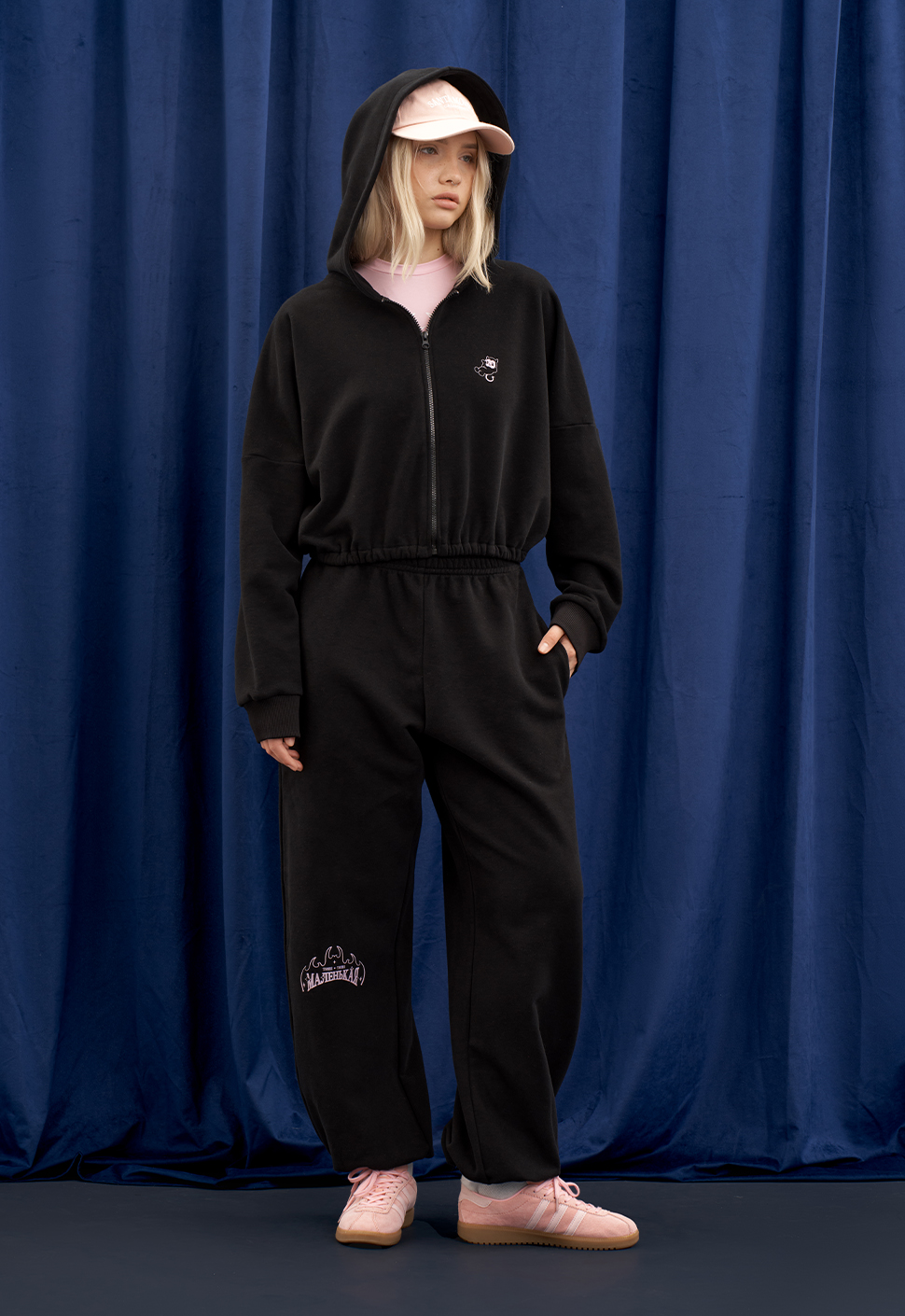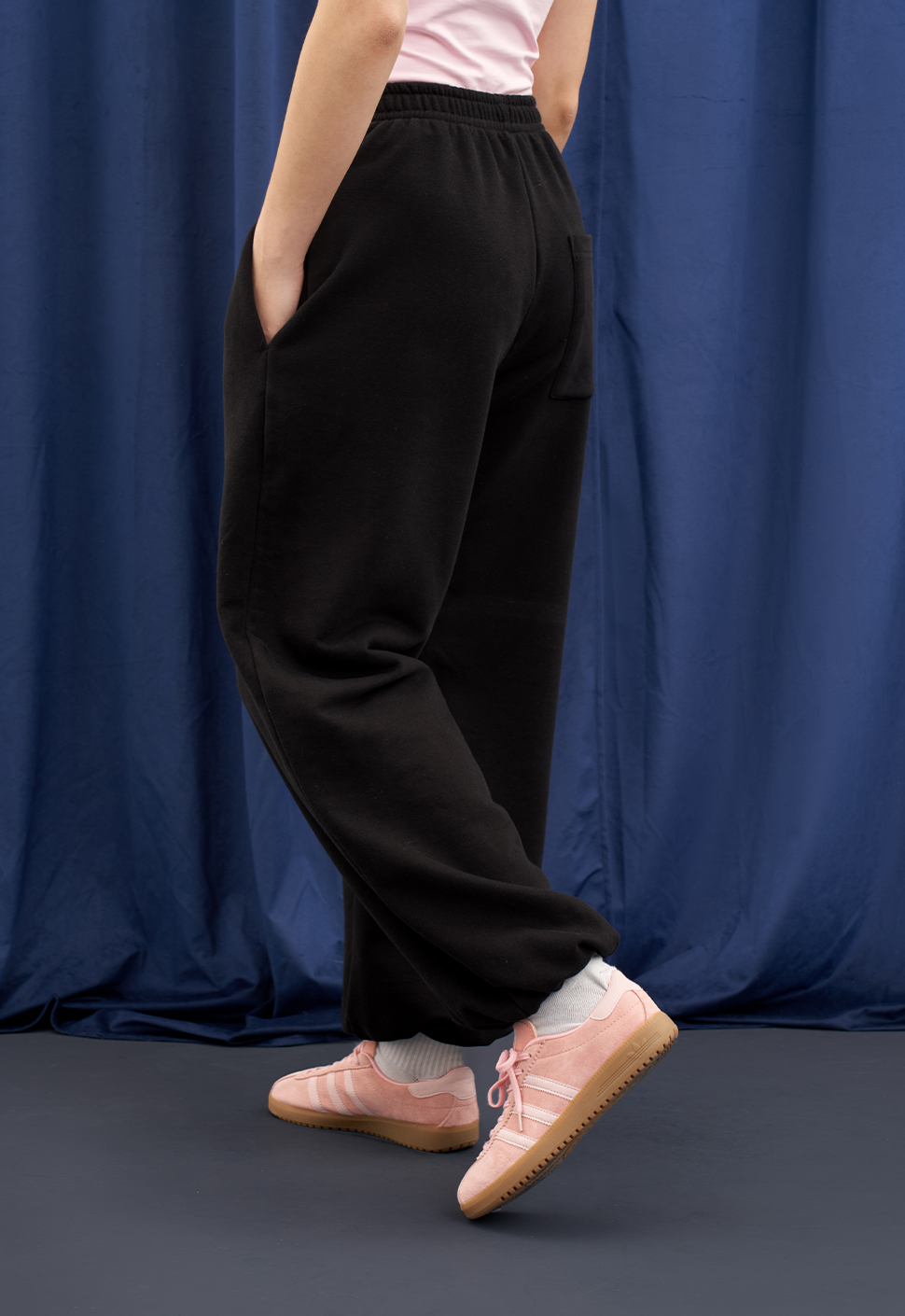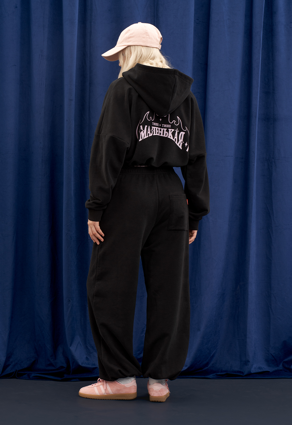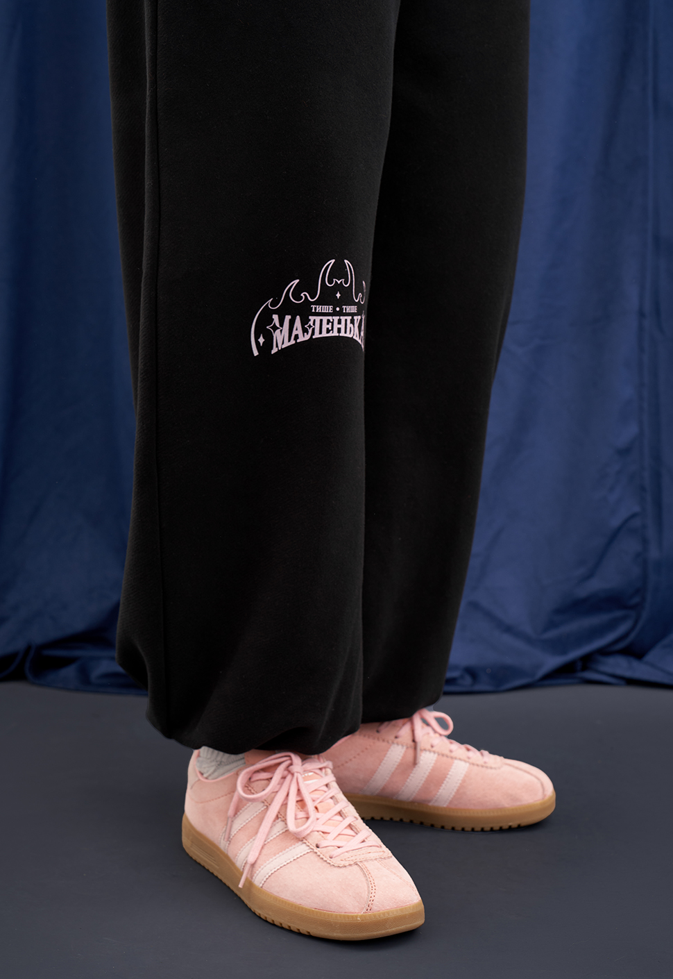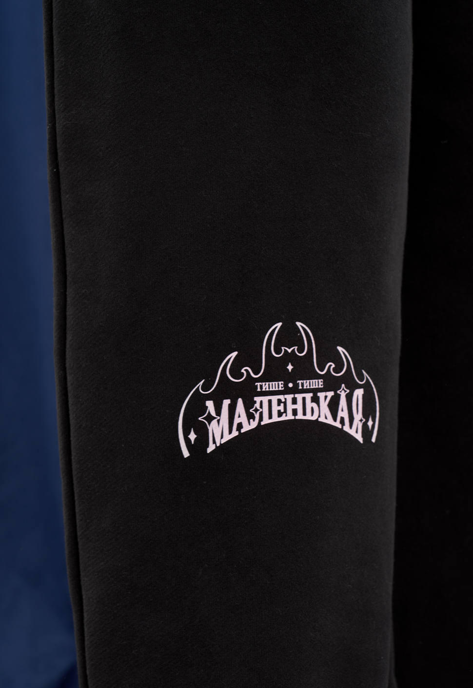 Брюки "Тише маленькая" черные выполнены из высококачественного хлопка с полиэстером и велюр-эффектом . Плотная резинка по поясу и низу штанины. Два кармана спереди, накладной карман сзади, жаккардовая бирка.